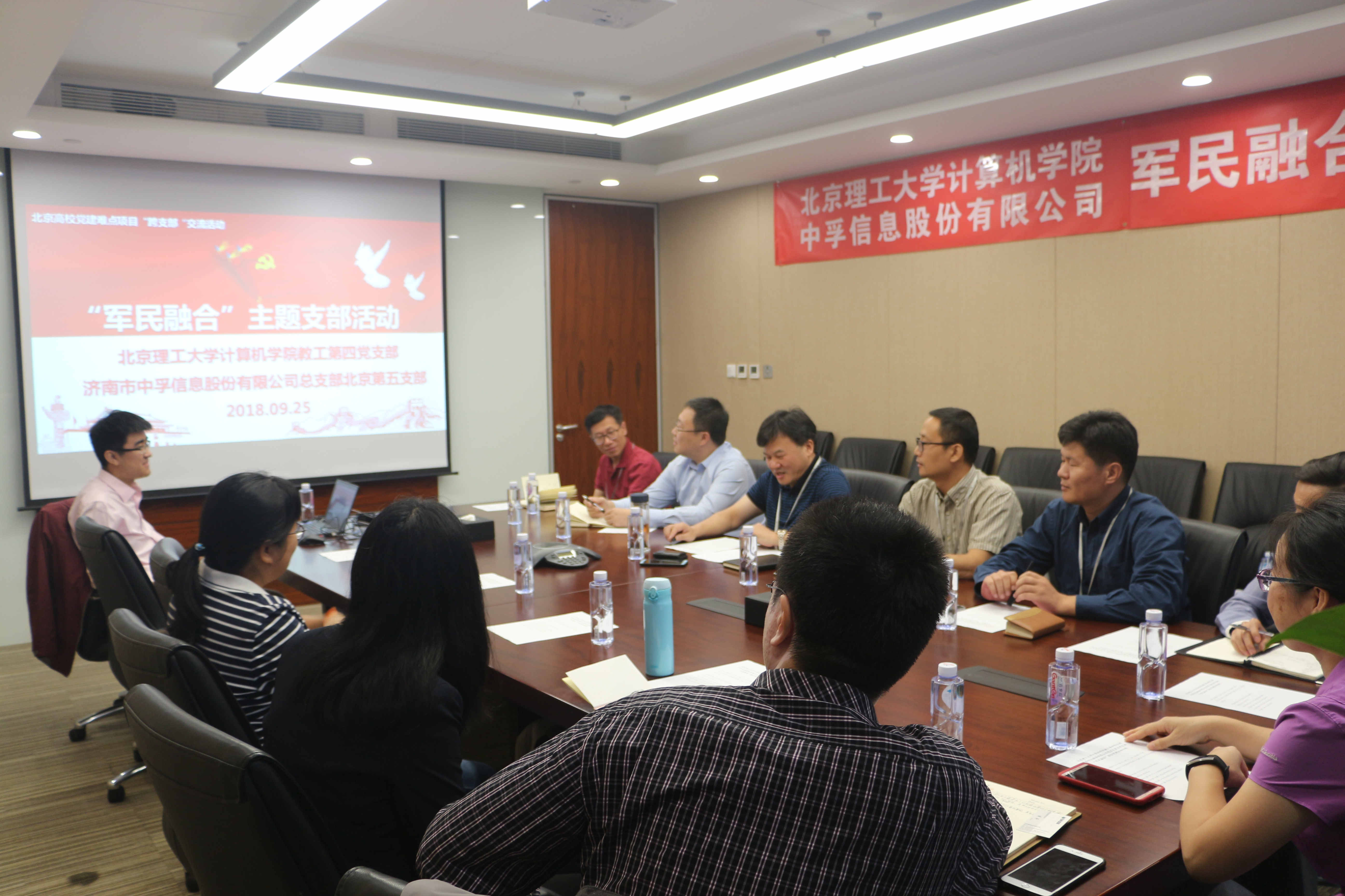 2018年9月25日上午,u体育第五党支部与北京理工大学计算机学院教工第四党支部,以“军民融合”为主题,进行首次联合党建交流活动。北京理工大学计算机学院教工第四党支部书记祝烈煌、u体育党总支书记张太祥以及双方部分党员同志参加了活动。